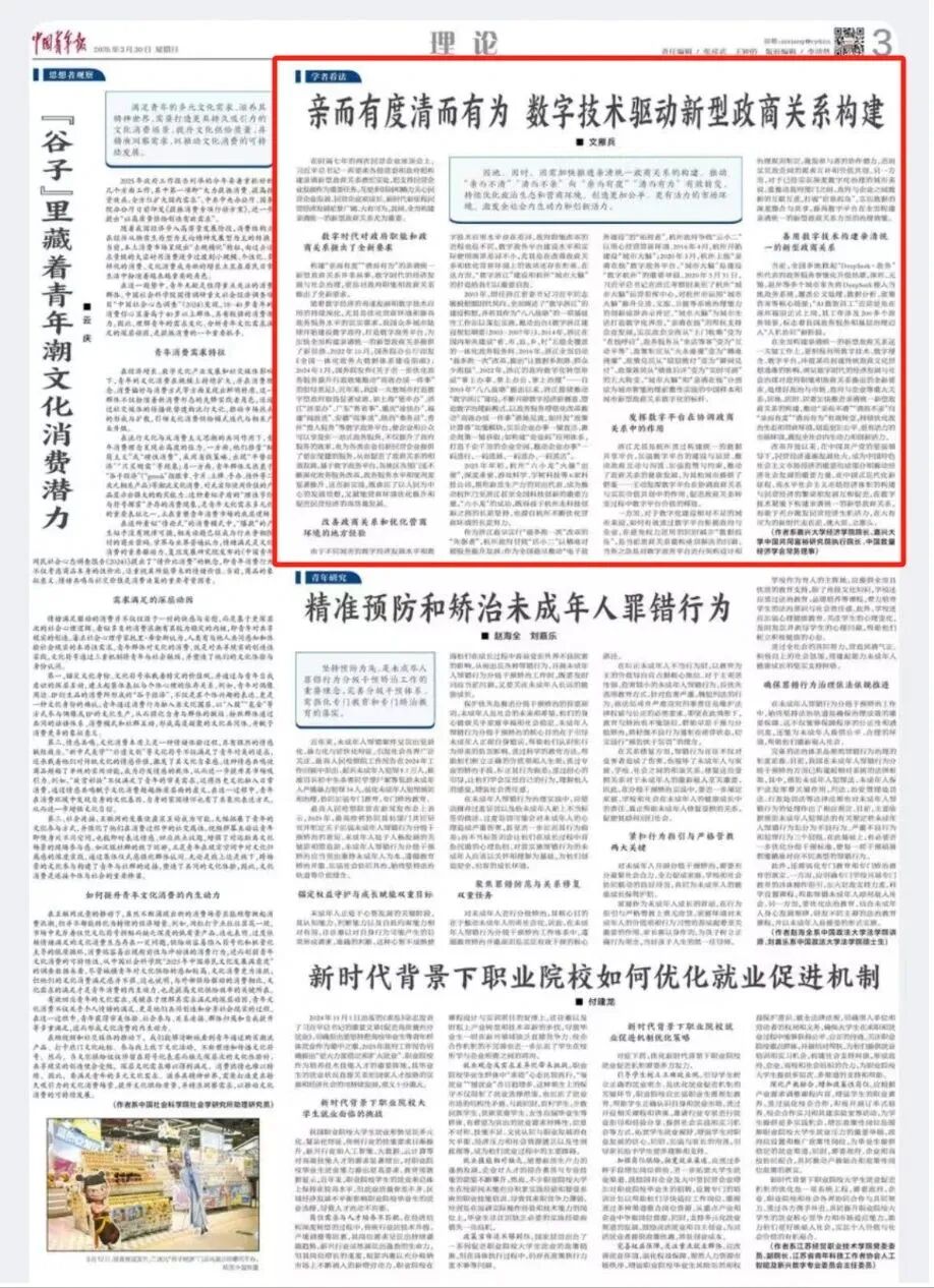 3月30日,我院执行院长文雁兵教授在中国青年报理论版发表理论文章《亲而有度清而有为 数字技术驱动新型政商关系构建》,文章认为,数字时代对政府职能和政商关系提出了全新要求,文章以“数字浙江”建设和杭州“城市大脑”建设的地方经验为例,以及根据全国多地掀起“DeepSeek+政务”所代表的政务服务智能化升级热潮,提出要善用数字技术构建亲清统一的新型政商关系,从而充分激发民营经济生机活力,在大有可为的新时代走在前、挑大梁、立潮头。